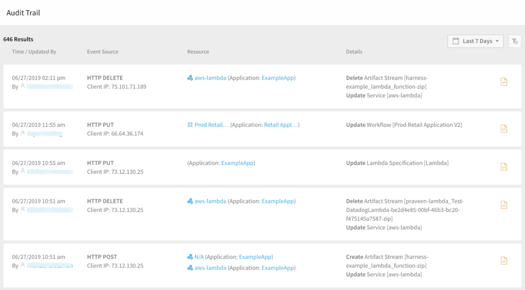 Harness provides auditing of events for Harness resources including accounts, applications, and application components. Harness Continuous Delivery Audit Trail enables you to track and review all events in one place.