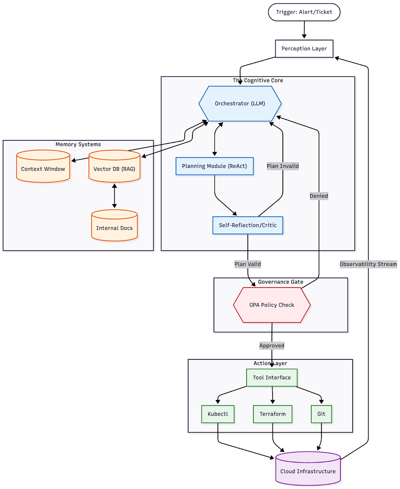 - Memory (The Context): Scripts are amnesiacs; they run and forget. Agents have memory. Using RAG (Retrieval-Augmented Generation), they pull from a Vector Database containing your entire history of runbooks, architectural diagrams, and past incident reports. They "remember" how you fixed this last time.