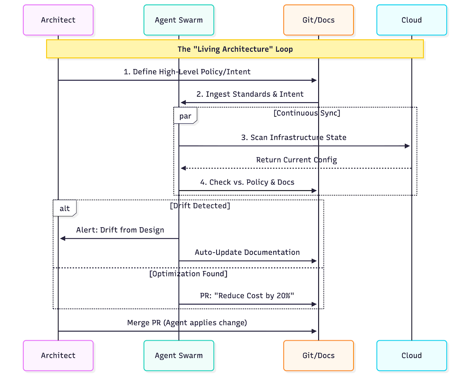 - The Shift: If a developer manually spins up an RDS instance, the Agent detects the drift, updates the architectural record, and alerts the architect that the implementation has deviated from the standard.