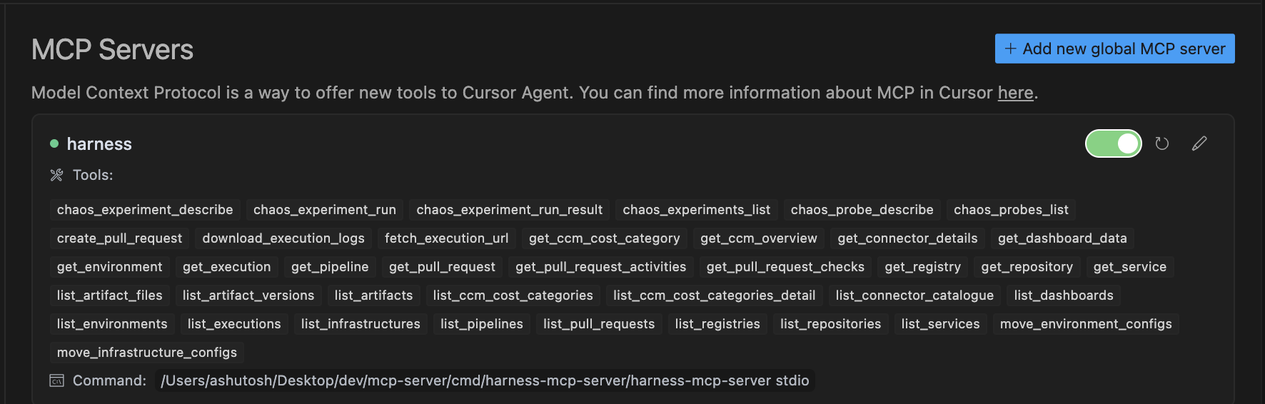 - Check MCP Status: In Cursor settings, verify the Harness MCP server appears as connected