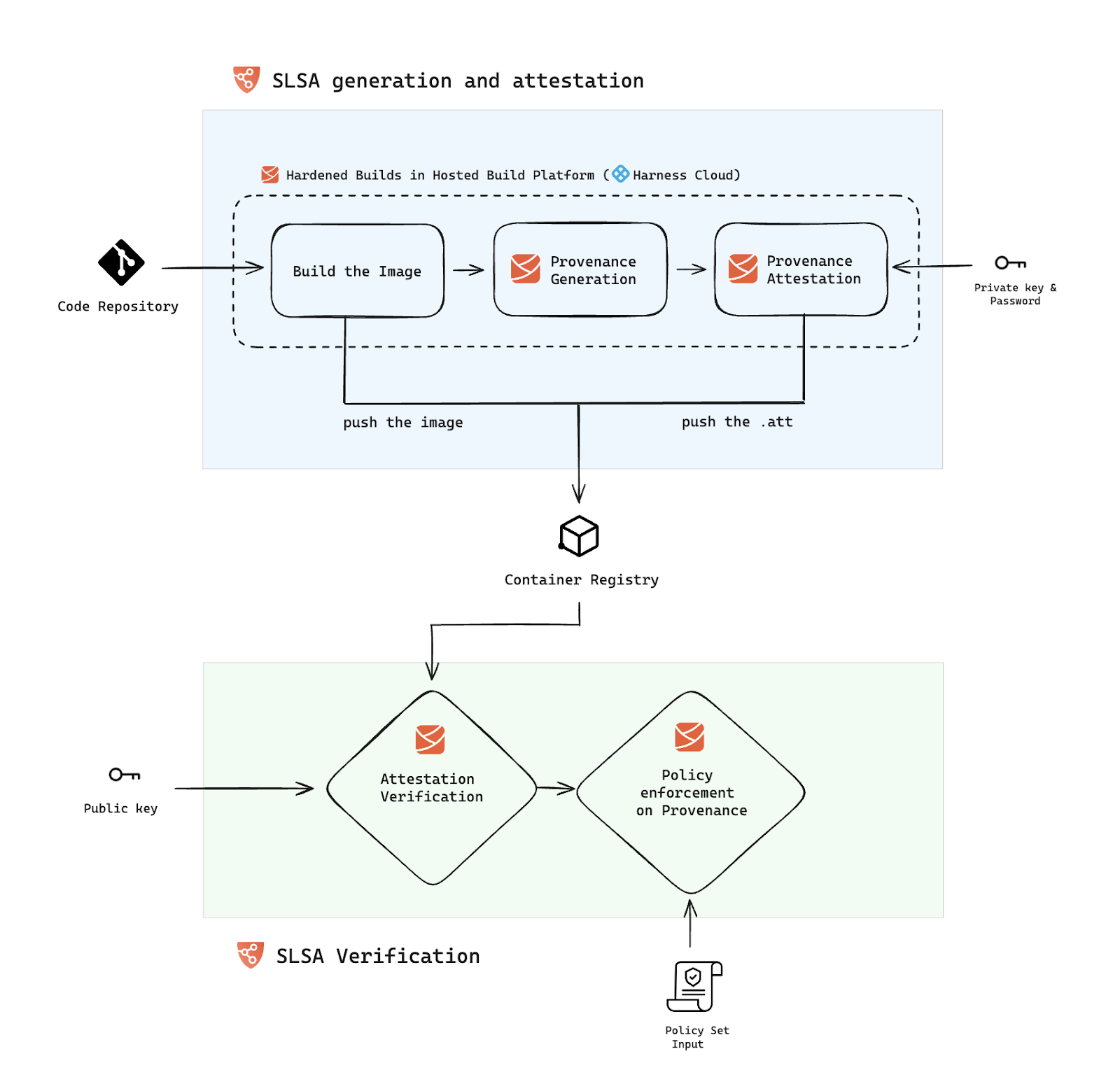 - Following the in-toto attestation framework with cosign, Harness digitally signs the generated provenance, ensuring its authenticity and integrity. Refer to generate SLSA provenance for the implementation.