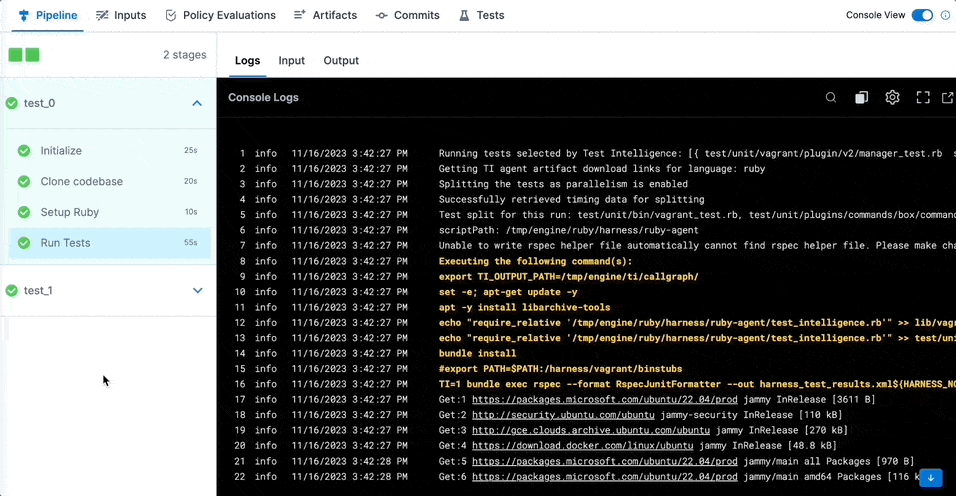 - You will see a subset of tests run between the two stages in your pipeline. Instead of running all 5,000+ Ruby rspec tests, TI selects only the subset of tests relevant to the change.