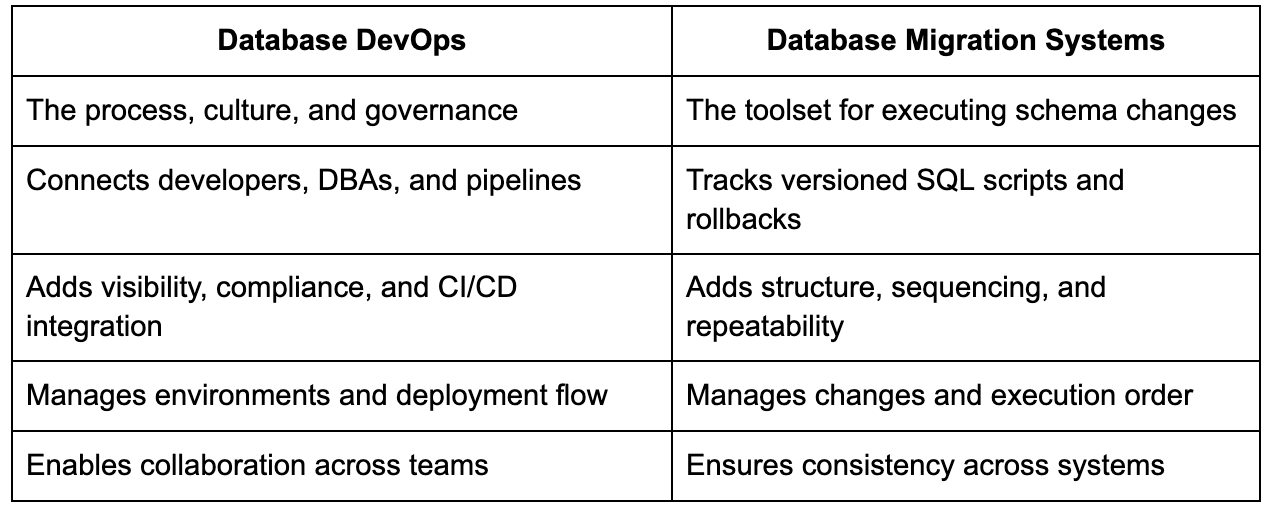 Database Migration Systems manage schema versioning and execution, while Database DevOps platforms manage the orchestration, governance, and automation of those migrations across environments.