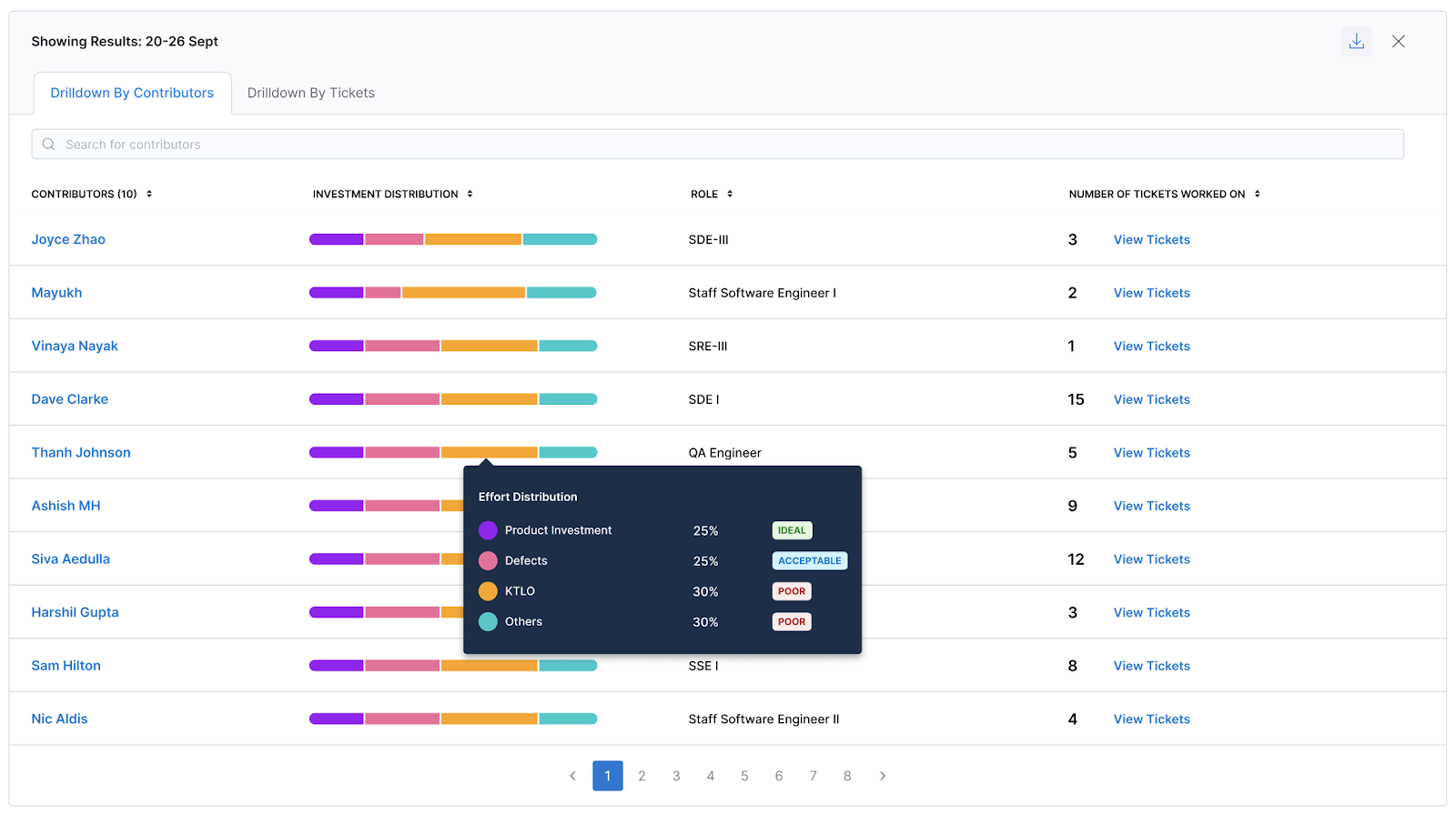 You can use these drilldown views to visualize data related to the effort invested across different business categories, such as new features and defects. This helps you understand work distribution, resource allocation requirements, and bottlenecks in your team and thus allows you to generate reports for continuous data for individuals and teams.