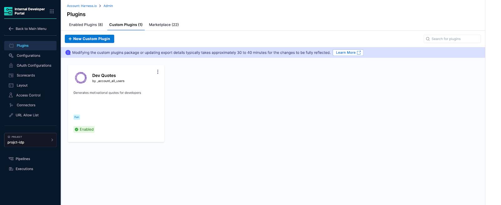 - Added support for custom plugins: We have added support for custom plugins, which enables users to upload their own frontend backstage plugins to Harness IDP. This feature is behind the feature flag IDP_ENABLE_CUSTOM_PLUGINS. To enable the feature, please reach out to IDP team or contact Harness Support.