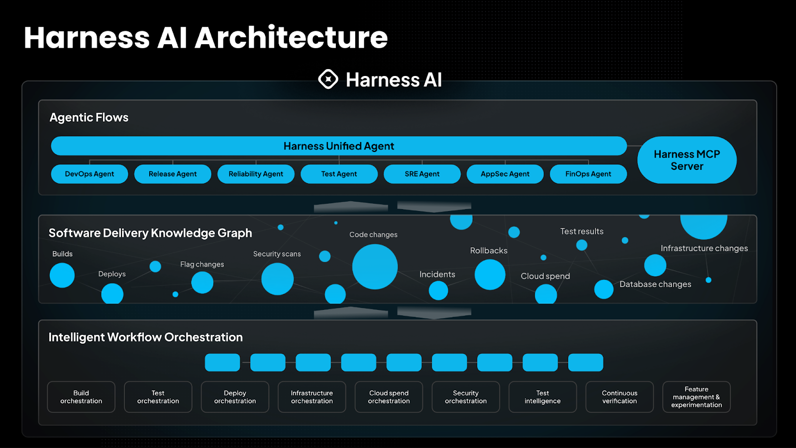 You don't need to install anything new, manage external credentials, or lose control of your workflows. Harness AI works directly within the Harness Platform you already use, integrating seamlessly with your CI/CD pipelines, Feature Flags, Cloud Cost Management, and Security Testing. Behind the scenes, specialized AI agents work together to automate tasks intelligently.