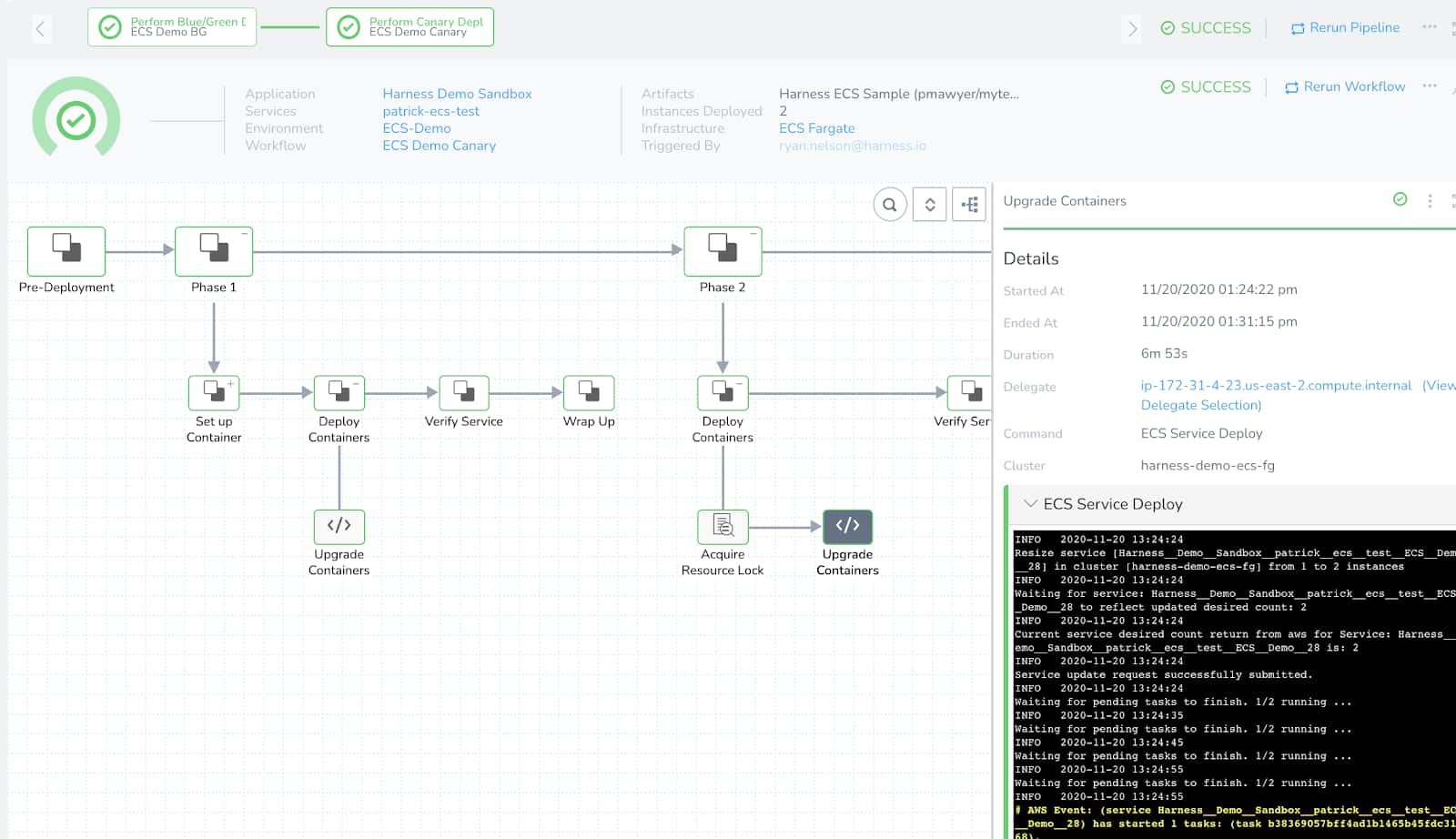 Less Scripting - With a reduction in scripting for ECS Run Tasks, users no longer need to script out test scripts or short term workloads. Harness has a native integration with ECS to allow the user to visualize the result of tasks and take the respective action.
