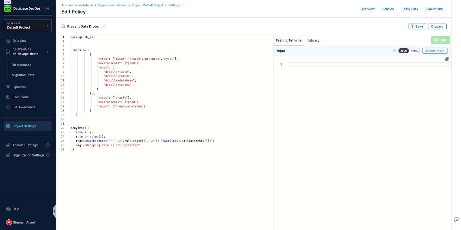 Your DBA can centrally define policies that all database deployment will be tested against. These policies can analyze the requested change, as well as details such as database type and name from the database instance the changes will be run against. This granular control enables centralized enforcement while also permitting some operations to be allowed in development and test environments, while blocking them in production.
