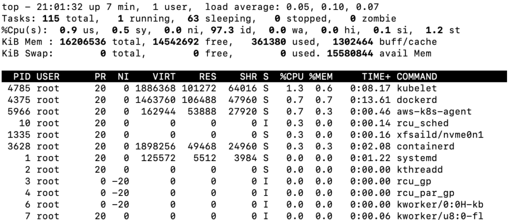 The Kubernetes worker node has a few pieces of overhead that run. Each pod you run has overhead and there is a sunk Daemon cost on each node. Looking at a baseline with no workload on a worker node, you can see the amount of available resources if Kubernetes has access to 100% of the available resources after overhead.