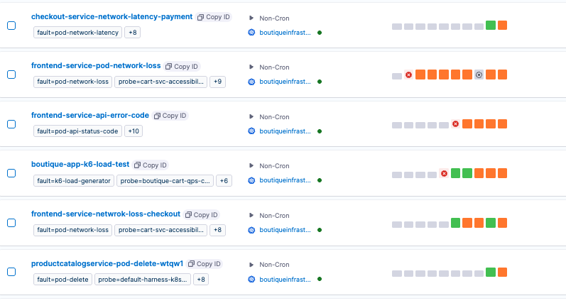 The experiments are created using the above faults and tuning them for the targeted services such as Frontend, Checkout, and ProductCatalog in the OnlineBoutique All the resilience probes created above can be attached to each experiment so that the resilient state is checked with each experiment.