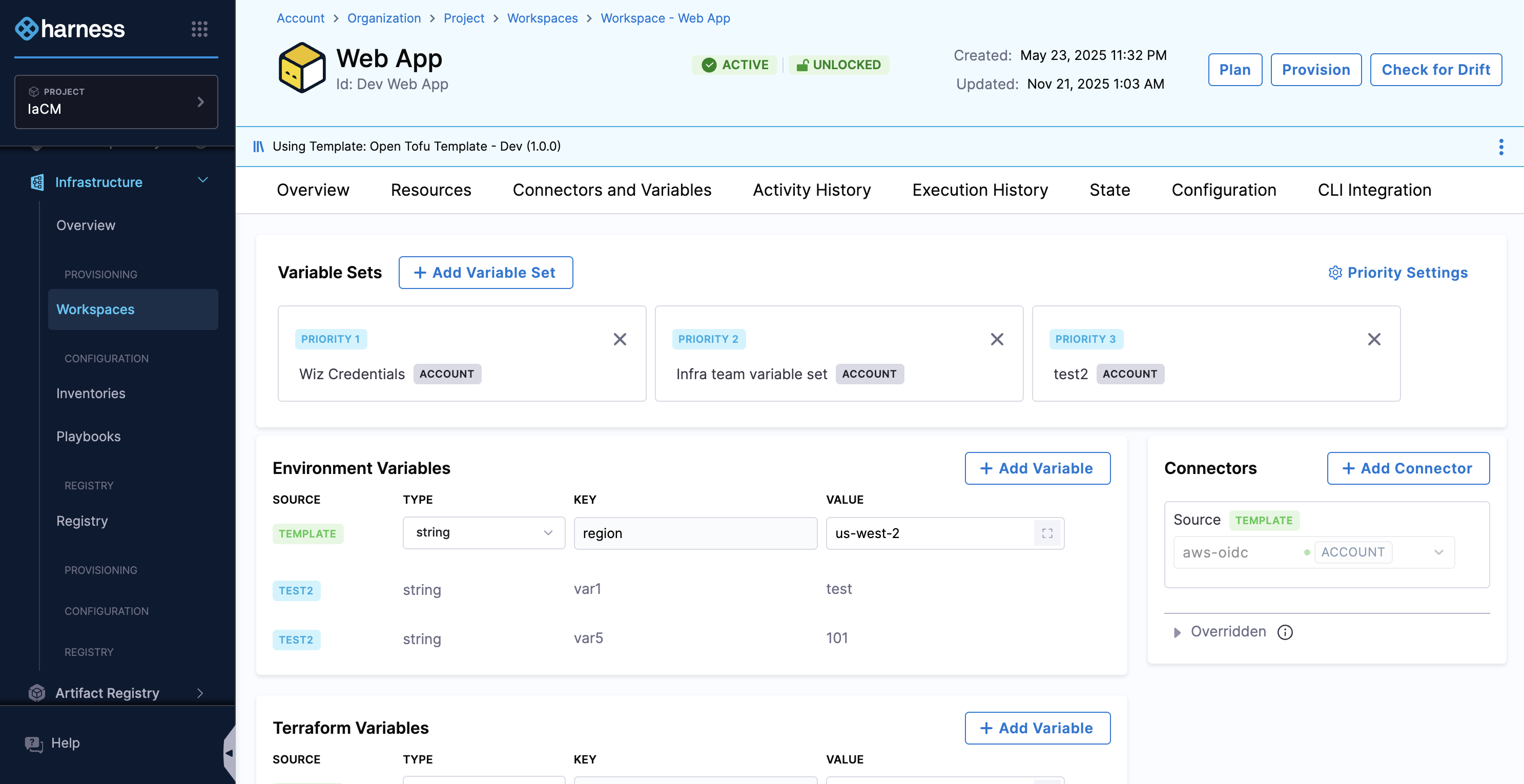 - Type and Scope Support: Handles both regular key-value pairs and .tfvars files. Variables can reference Harness Connectors (e.g., Vault or AWS Secrets Manager) for secure retrieval at execution. Both Terraform variable sets and OpenTofu variable sets can also be attached to Workspace Templates.