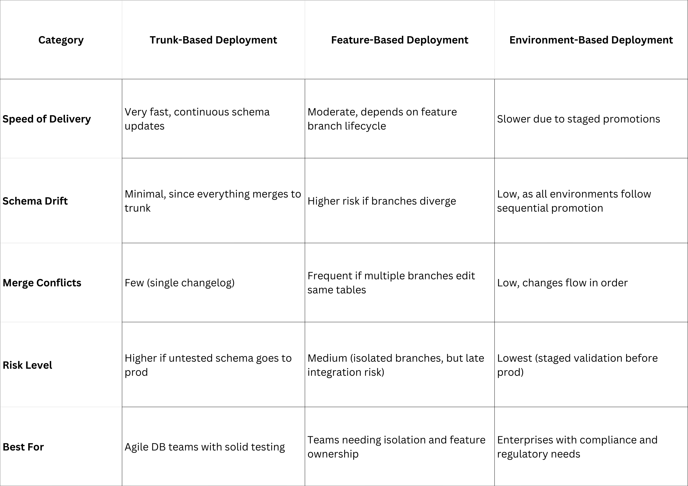 In modern Database DevOps, three approaches stand out: trunk-based deployment, feature-based deployment, and environment-based deployment. Each comes with unique strengths and trade-offs when applied to database schema management with a single changelog file or multiple modular changelogs.