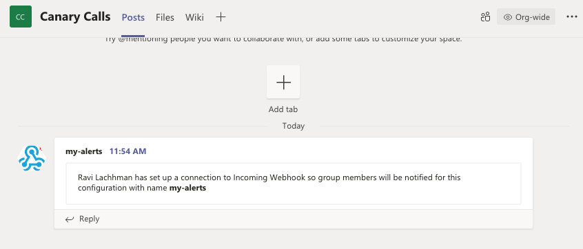 When installing into Microsoft Teams, you will need to pick a Channel. In my case, “Canary Calls” is the Channel where I want the alerts to go.