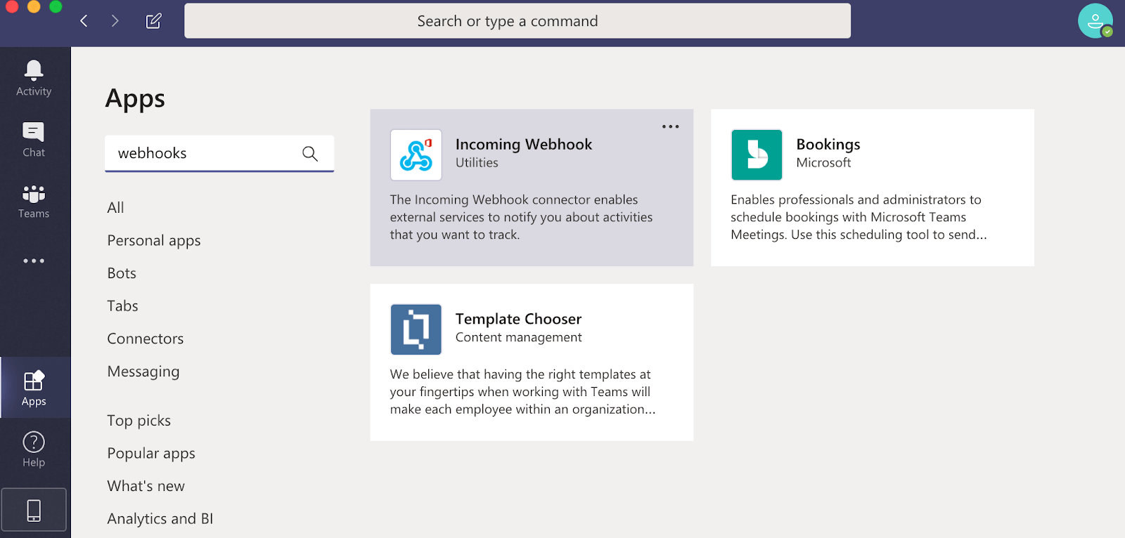 The integration focuses on the ability of Microsoft Teams to process an incoming webhook. You can set one up pretty quickly and for further details can follow the Microsoft Teams documentation. Adding the Incoming Webhook Application can be done by going to App -> search for “webhooks” -> Incoming Webhook.