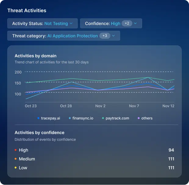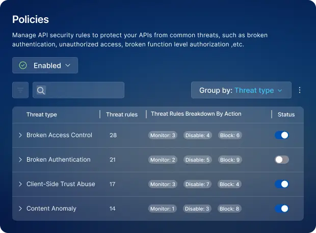 Monitor threat activity in real-time to detect access control bypasses, data exfiltration, and other API threats and quickly contain impacts.