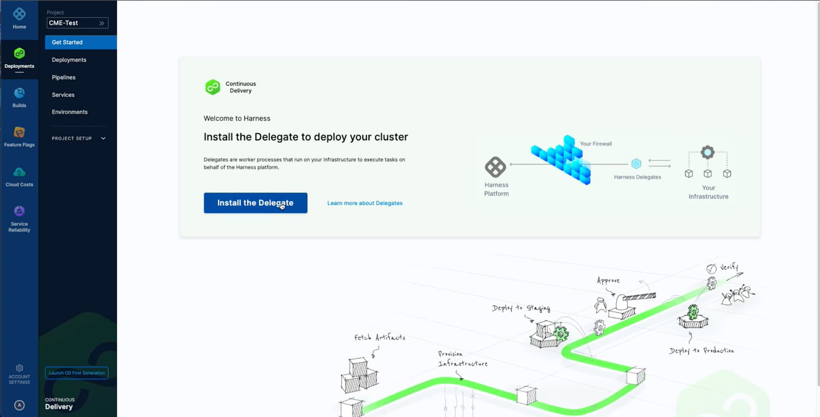 Setting up Harness starts with installing at least one Harness Delegate in your target infrastructure (such as a Kubernetes cluster, an ECS cluster, an EC2 subnet or a Pivotal Cloud Foundry space).