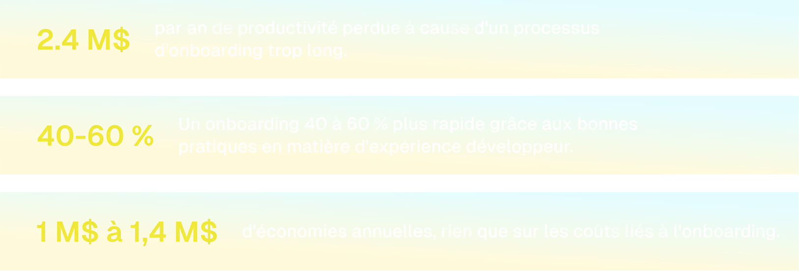 Améliorer l'expérience développeur grâce à une meilleure documentation, une planification rigoureuse et un provisionnement des environnements plus fluide accélère l'intégration des nouvelles recrues. En équipant les ingénieurs d'outils et de flux de travail efficaces, le temps nécessaire aux nouvelles recrues pour atteindre leur pleine productivité est considérablement réduit.Pour une entreprise de 1 000 développeurs, cela représente des économies significatives :